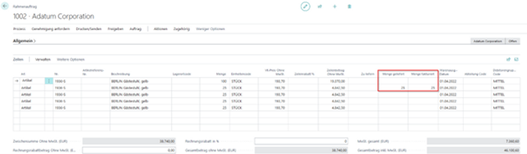 Nachdem der Rahmenauftrag in einen Auftrag umgewandelt wurde, enthält dieser die Zeile, in der Sie im Rahmenauftrag das Feld zu liefern ausgefüllt haben. Sie können diese Zeilen bearbeiten oder löschen oder unverändert beibehalten.