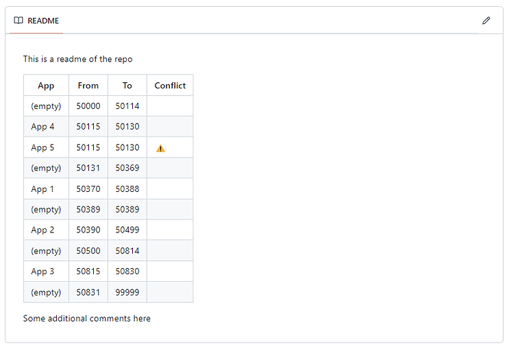- Check for Overlaps: The overlap function compares each app’s range with previously declared ranges. If any range overlaps with another app’s range, a conflict marker (⚠️) is added to the table.