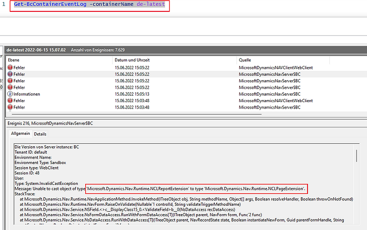Let take a look at the event log by running powershell and the "Get-BcContainerEventLog"